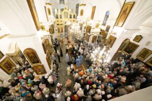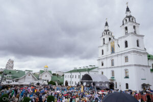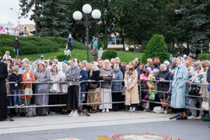 За богослужением молилось большое количество людей, приехавших со всех уголков Беларуси, а также участники IV Всебелорусского крестного хода «Жировичи-Минск» и прихожане кафедрального собора.
