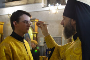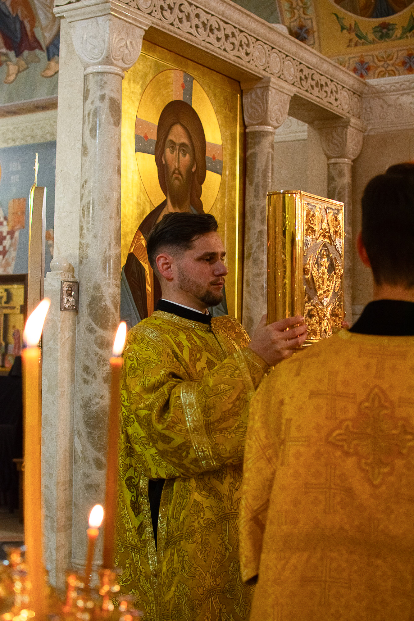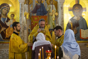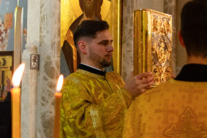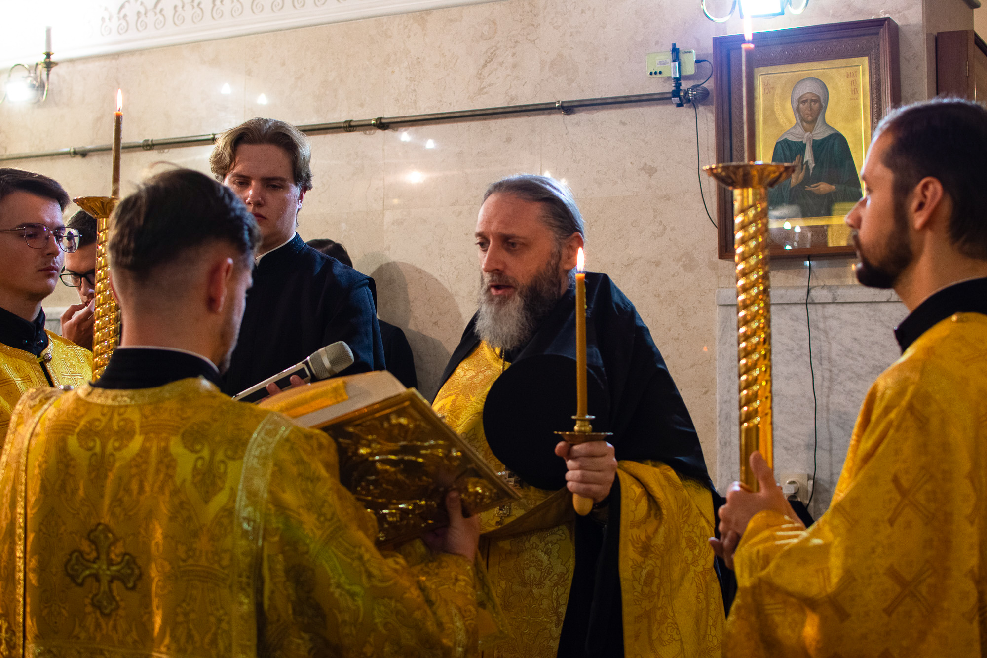 Всенощное бдение и Божественную литургию возглавил проректор по воспитательной работе иеромонах Андрей (Василюк). Ему сослужили иереи Виктор Кулага и Константин Голубев, а также диакон Дмитрий Вабищевич.