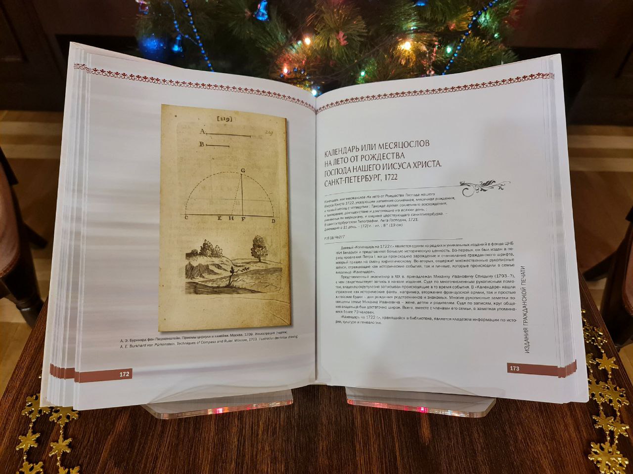 Книги гражданского шрифта представлены следующими изданиями: «Опыт исторического словаря о российских писателях» (1772) Н. И. Новикова, «Свет зримый в лицах» (1773) Вилля Георга, «Образование древних народов» (1795–1796) Мишеля Франсуа Дандре-Бардона и многими другими уникальными библиографическими редкостями.