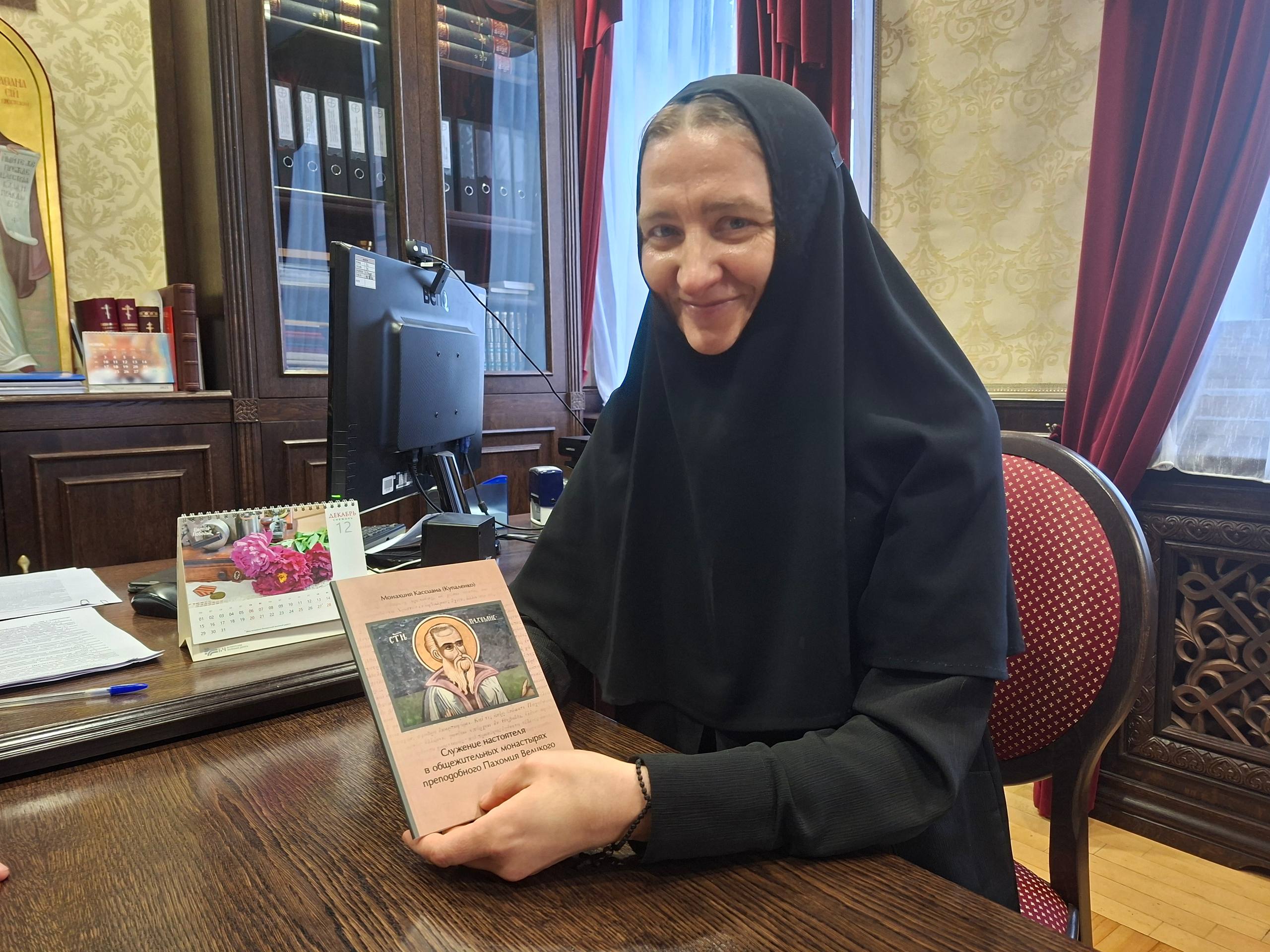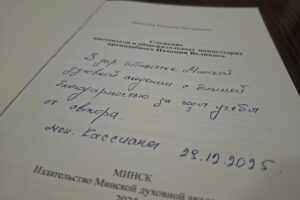 29 декабря 2025 года в Минской духовной академии состоялась встреча ректора архимандрита Афанасия (Соколова) с выпускницей магистратуры, настоятельницей Архиерейского подворья в честь преподобного Паисия Святогорца в д. Ольжево Лидской епархии Белорусского Экзархата Московского Патриархата монахиней Кассианой (Купаленко). Она передала в дар библиотеке Академии в честь митрополита Филарета (Вахромеева) печатное издание своего магистерского исследования “Служение настоятеля в общежительных монастырях преподобного Пахомия Великого” с подписью: «В дар библиотеке Минской духовной академии с большой благодарностью за годы учебы от автора. Монахиня Кассиана 29.12.2025».