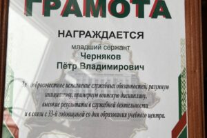На мероприятии за добросовестное исполнение служебных обязанностей, разумную инициативу, примерную воинскую дисциплину, высокие результаты в служебной деятельности грамотой был награжден студент аспирантуры Минской духовной академии, младший сержант Петр Черняков, на данный момент проходящий военную службу в армии.