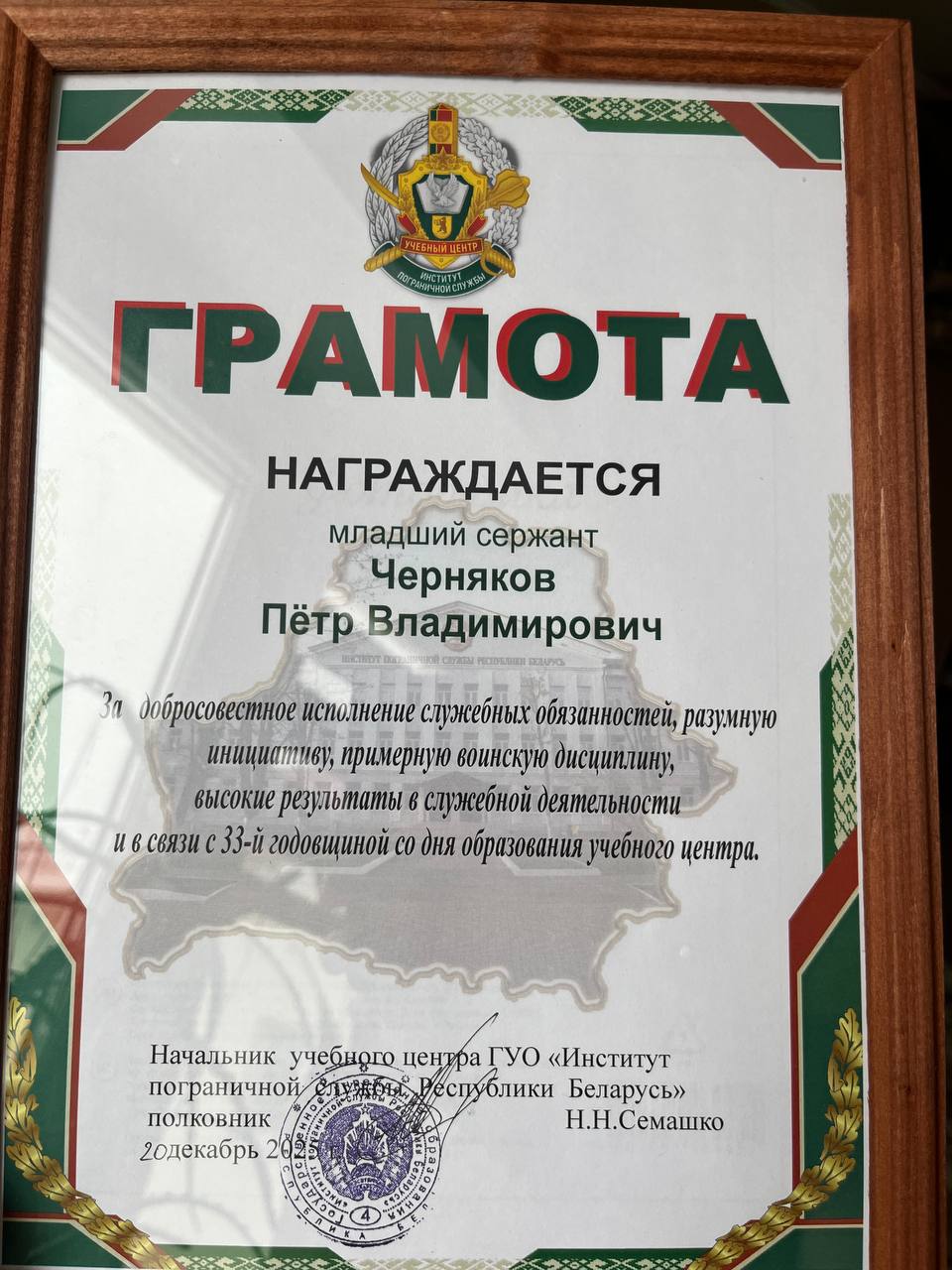 Аспиранту Академии вручили грамоту в связи с 33-летием учебного центра ГУО «Институт пограничной службы Республики Беларусь»