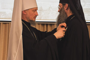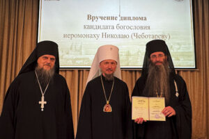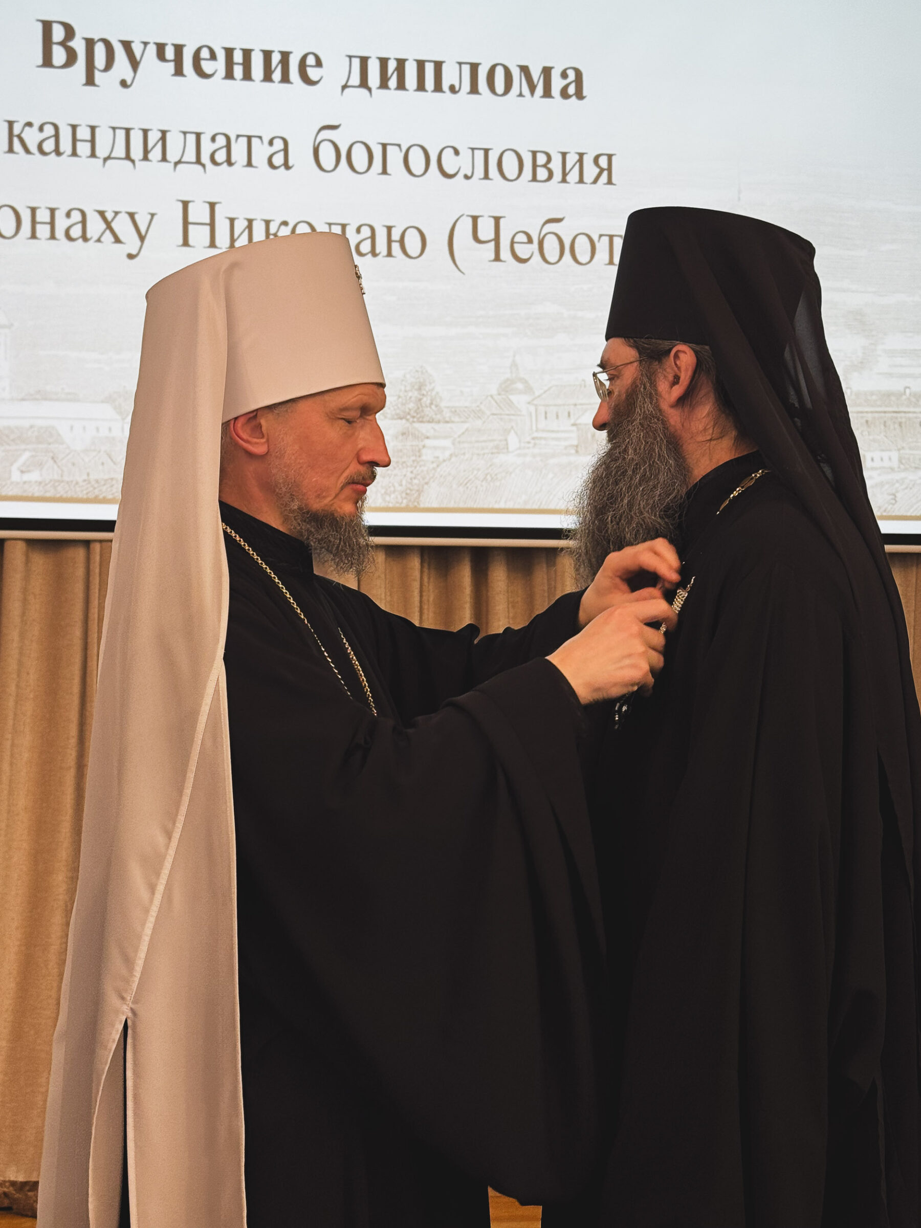 В рамках конференции Митрополит Вениамин вручил диплом и знак кандидата богословия иеромонаху Николаю (Чеботареву).