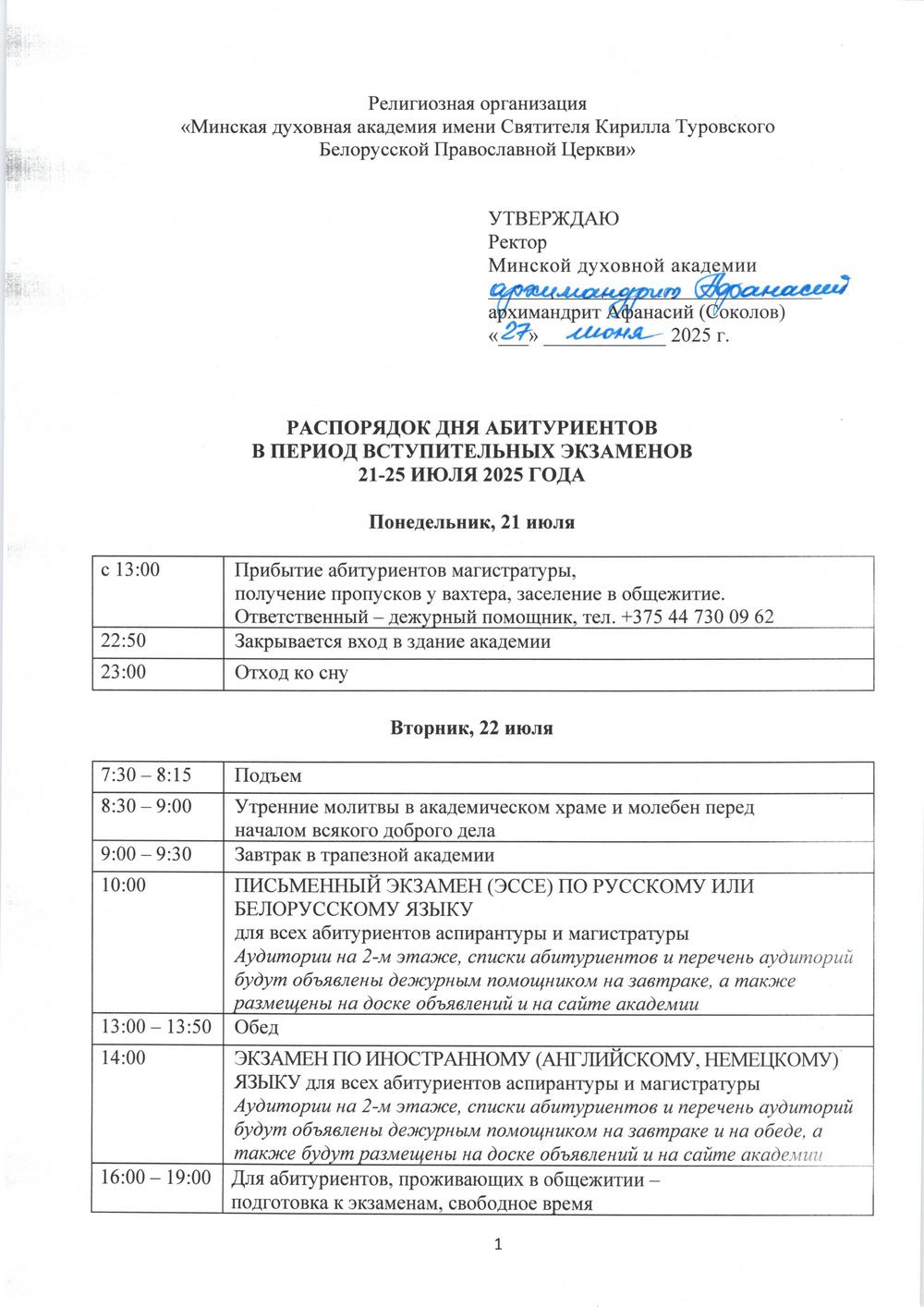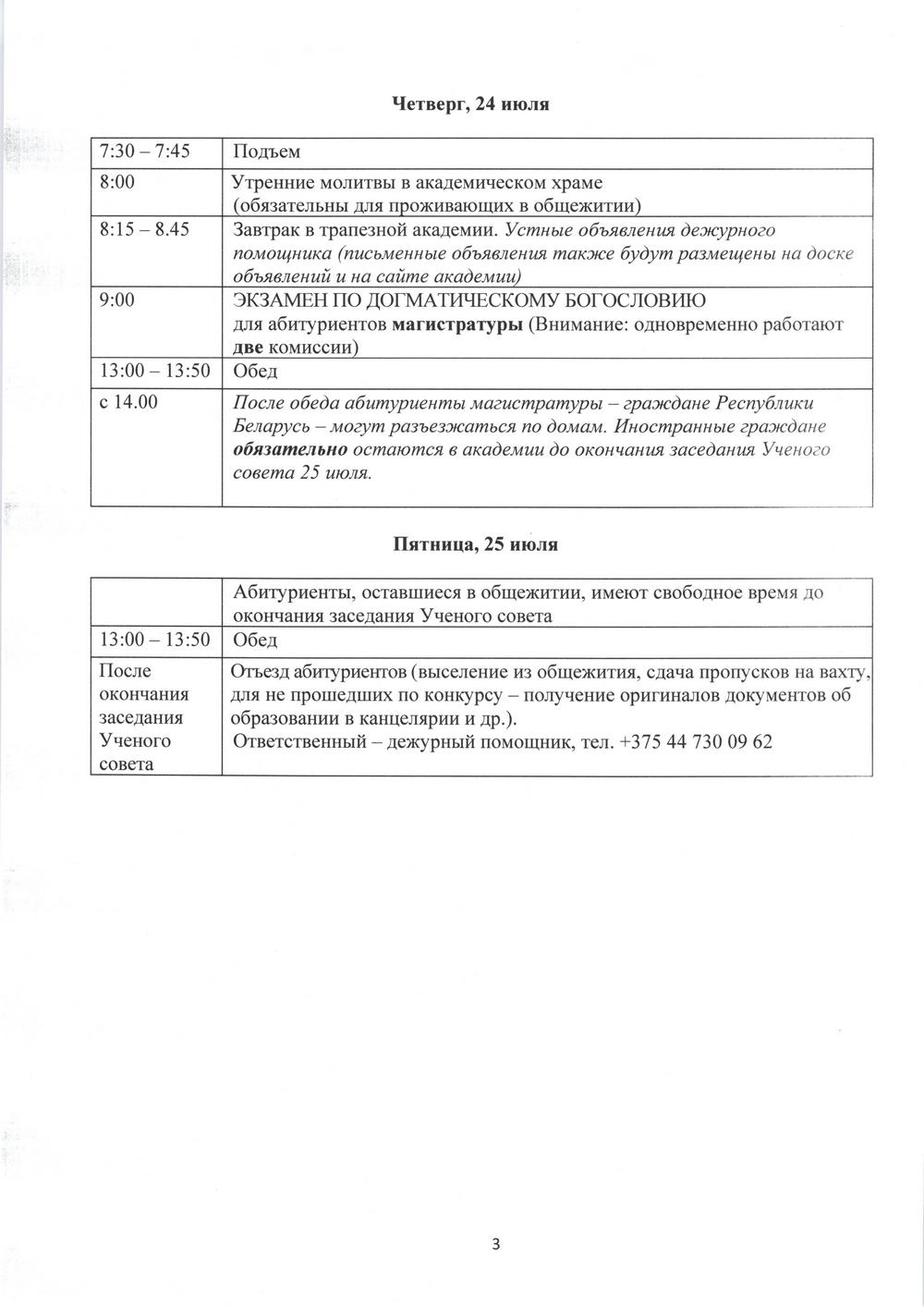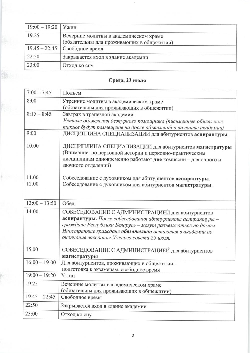 Распорядок дня в период вступительных экзаменов Академии